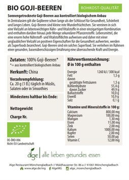 - Zutaten: 100 % Goji Beeren aus kontrolliert biologischem Anbau