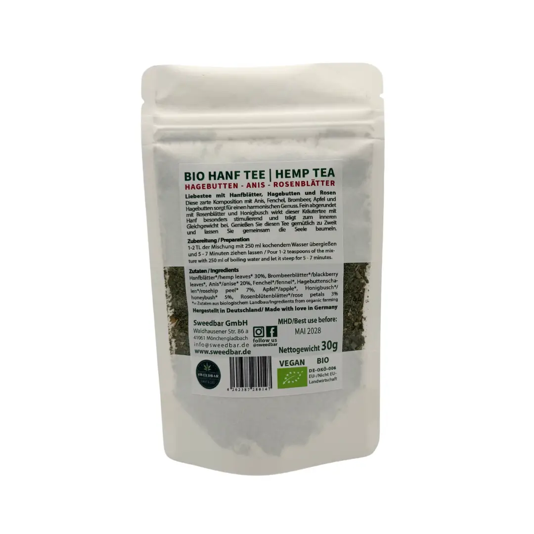Gleich zu Beginn zeigt der Bio Hanf Tee Sweed Love seine besonderen Qualitäten. Hochwertige Hanfblätter aus genehmigtem europäischem Anbau treffen auf fruchtige Hagebuttenschalen, milden Honigbusch und zarte Rosenblütenblätter. Ergänzt wird die Komposition durch Anis, Fenchel, Brombeerblätter und Apfel. Das Ergebnis ist ein ausgewogener Bio Hanf Kräutertee, der Wärme, Harmonie und Genuss vermittelt.