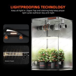 Die weiße PAR+ Innenfolie reflektiert 97 % des Lichts, reduziert Wärmeentwicklung und maximiert so die Photosyntheseleistung deiner Pflanzen. Die zusätzliche Höhe (220 cm) erlaubt dir, auch große Pflanzen oder Hängesysteme unterzubringen – perfekt für 400 W LED-Setups oder Hydrosysteme.