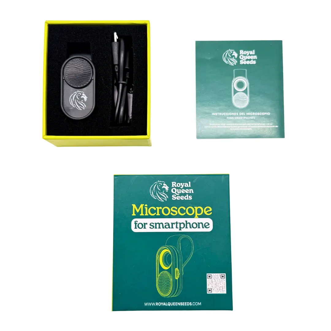 Das Royal Queen Seeds Smartphone Mikroskop mit 100-facher Vergrößerung ist das ideale Tool für Grower, die ihre Pflanzen bis ins kleinste Detail beobachten wollen. Einfach auf Dein iOS- oder Android-Smartphone aufstecken und schon kannst Du Trichome, Schädlinge und Pflanzendetails in beeindruckender Makroqualität betrachten.