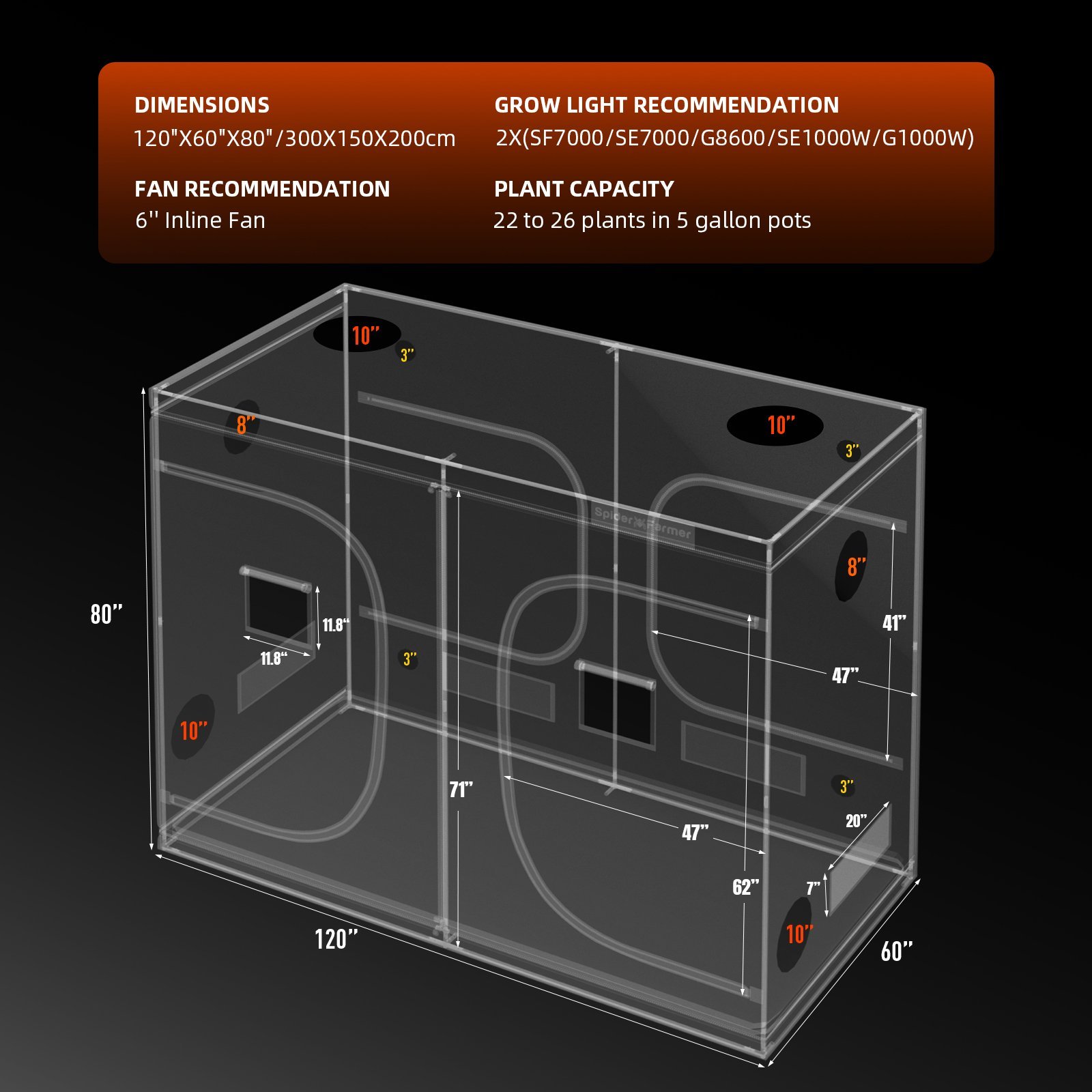 Der stabile 16-mm-Stahlrahmen trägt bis zu 110 kg Equipment, die 1680D Oxford Stoffverkleidung ist lichtdicht und reißfest, und das 100 % reflektierende Mylar-Innenfutter sorgt dafür, dass jedes Watt deiner Beleuchtung bei den Pflanzen ankommt. Kombiniert mit zwei starken LEDs wie SE7000, SF7000 oder SE1000W erreichst du eine gleichmäßige, intensive Ausleuchtung von vorne bis hinten – das bedeutet dickere Buds, höhere Harzproduktion und Erträge, die dich wirklich beeindrucken werden.