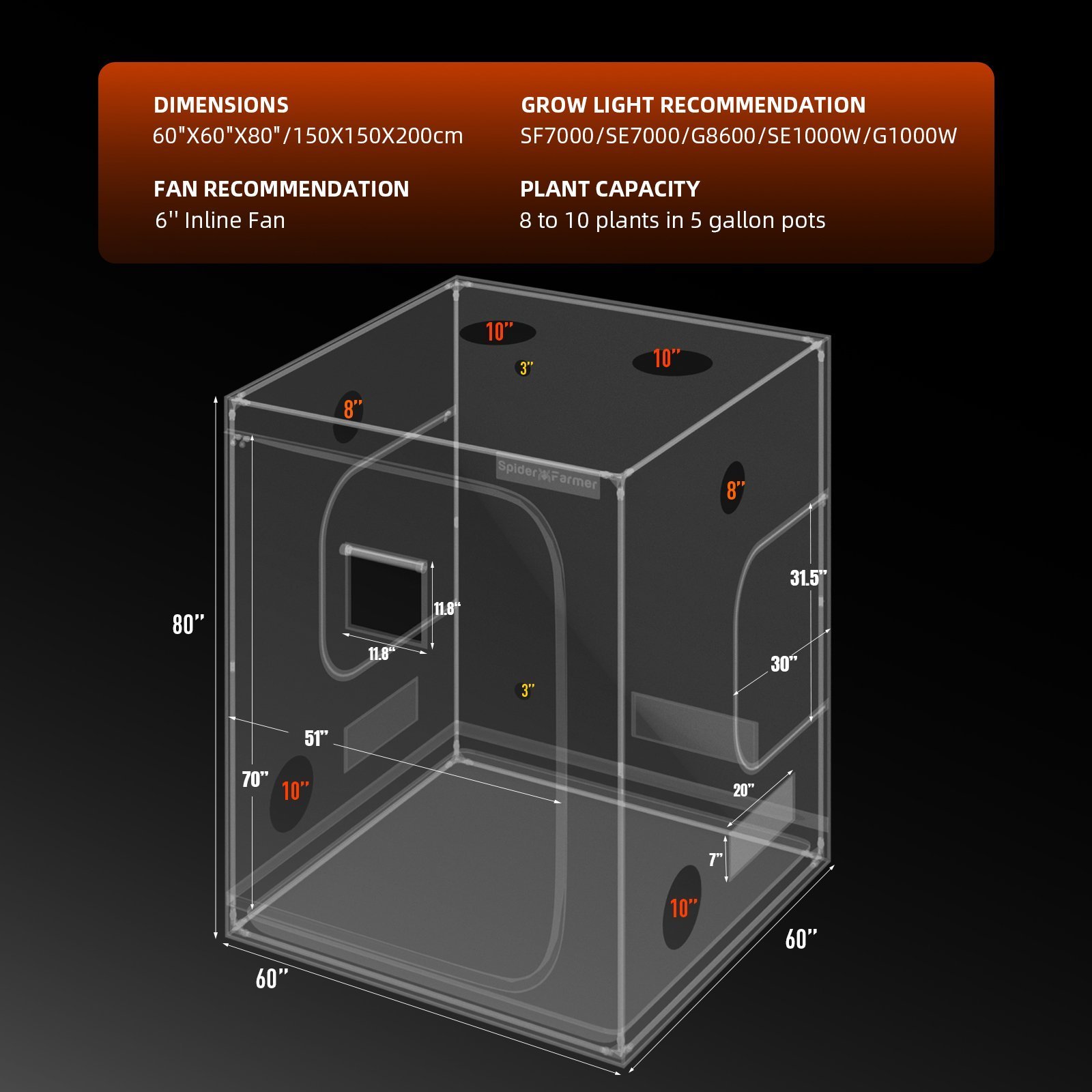 • Growzelt: 150×150×200 cm (5×5 ft)