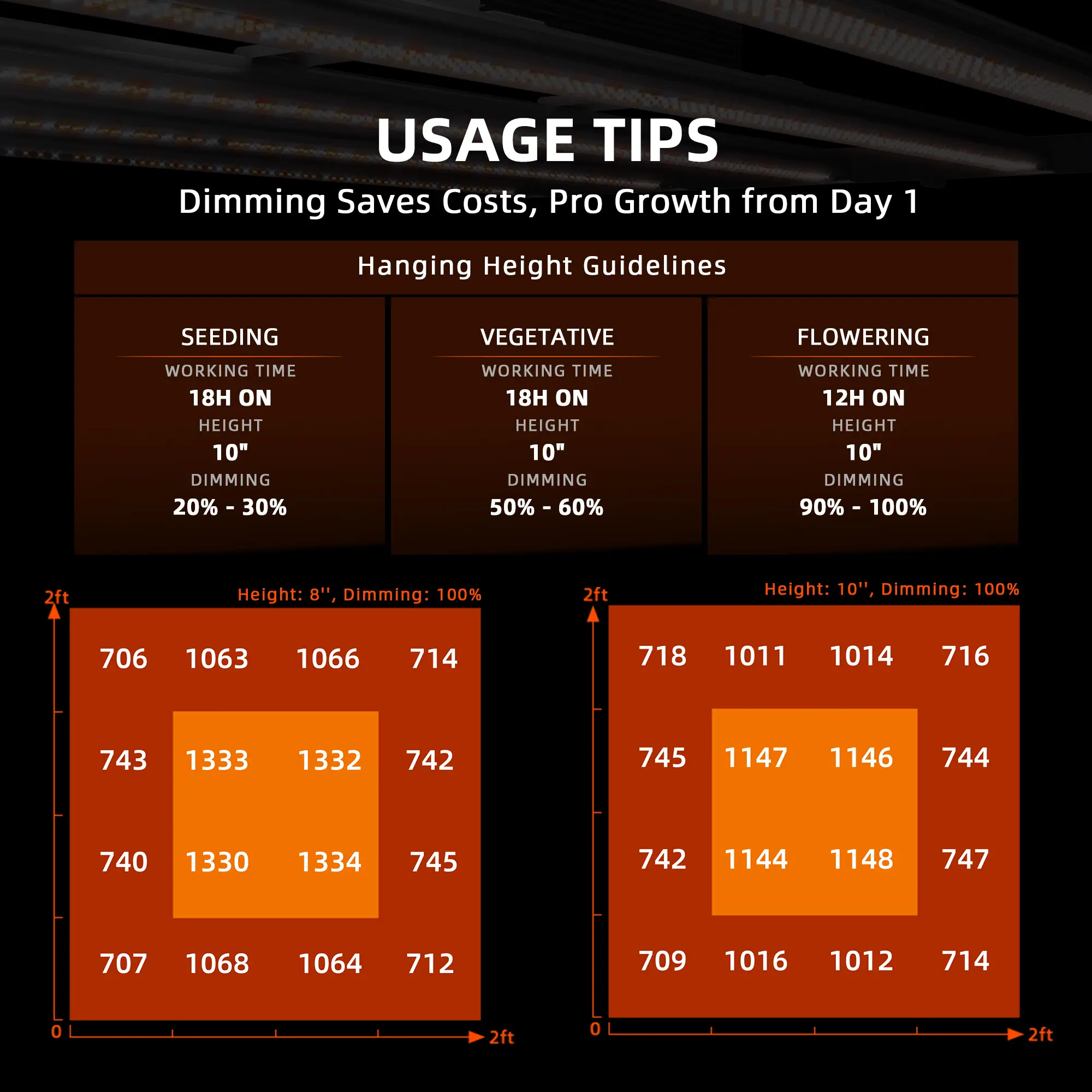 Die Bridgelux LEDs aus den USA sorgen für hohe Lichtdichte, gleichmäßige Abdeckung und tiefere Lichtpenetration. Mit dem barförmigen Design wird die Wärme besser verteilt, Hotspots werden vermieden und Deine Pflanzen erhalten in jeder Ecke gleichmäßiges Licht – perfekt für 2×2 ft (60×60 cm) bis 3×3 ft (90×90 cm) Flächen.
