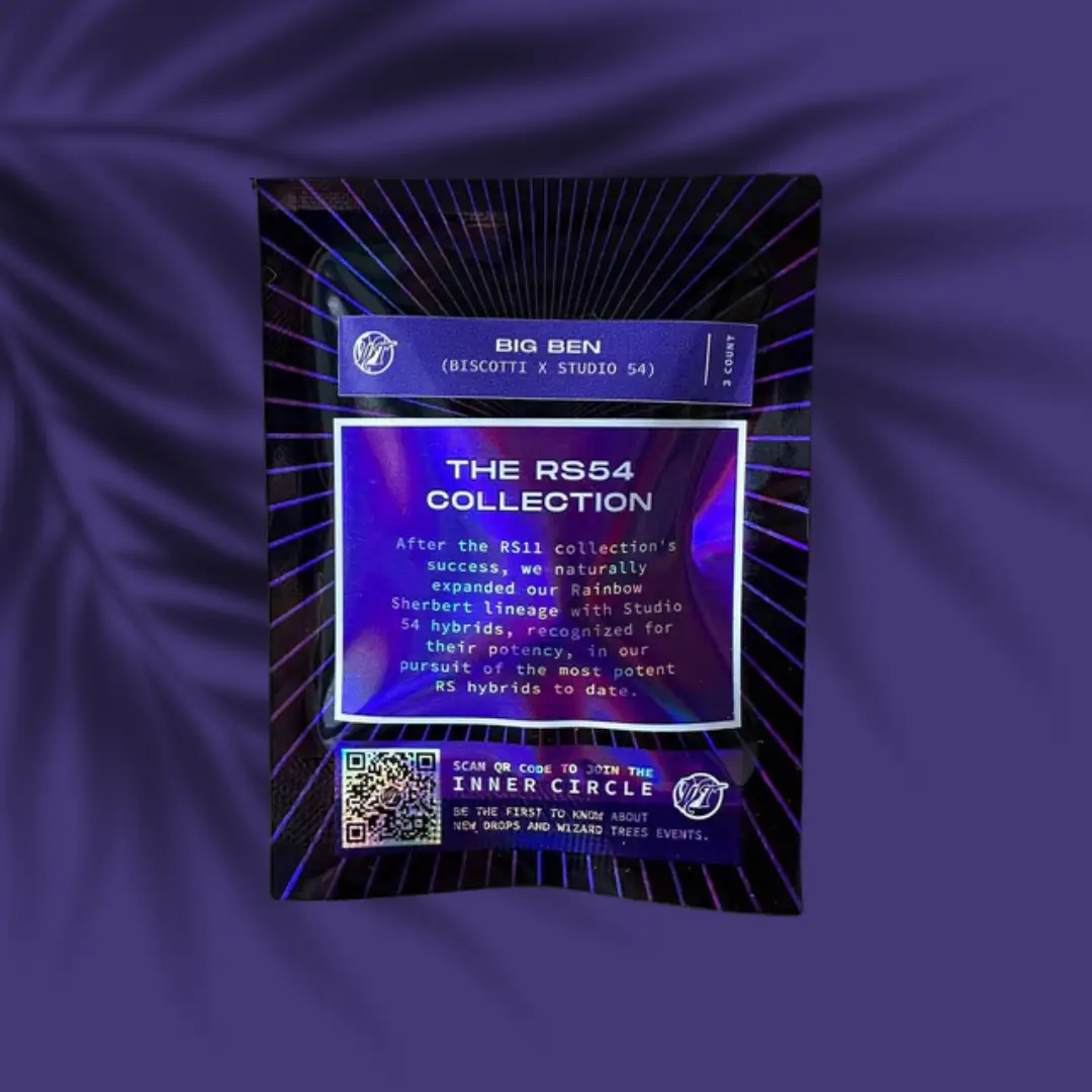 Die Wizard Trees Big Ben ist eine exklusive, indica-dominante Hybride, die aus der Kreuzung von Biscotti x Studio 54 entstanden ist. Diese Sorte kombiniert das süße Cookie-Dough-Aroma von Biscotti mit den lauten Gas-Noten von Studio 54 und liefert so ein unverwechselbares Terpenprofil. Mit 15–25 % THC, einer mittleren Blütezeit von 56–65 Tagen und hohem Ertragspotenzial ist Big Ben die perfekte Wahl für Grower und Genießer, die auf ein intensives Geschmackserlebnis und starke Wirkung setzen.